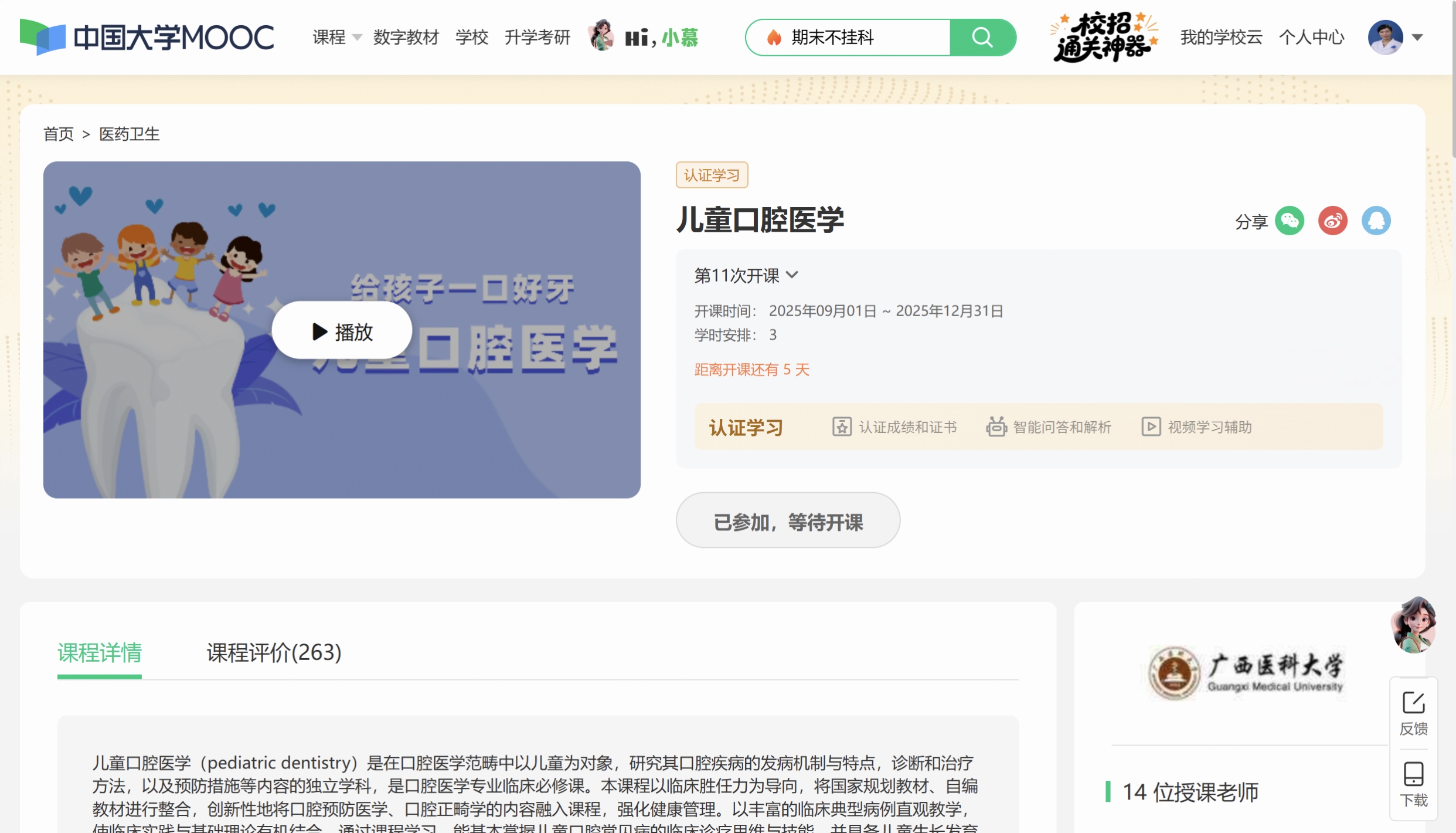 据悉,《儿童口腔医学》课程依托多学科融合与创新实践,形成三大鲜明特色。在内容建设上,既强化口腔预防医学、正畸学等交叉知识,融入最新专家共识与临床指南,又收录60余例自主知识产权典型病例、1900余张影像资料及全国首款儿童专用X线头影测量分析软件,同时搭建思政元素库,每章节配套思政案例与主题讨论,实现“知识+能力+素质”三位一体培养。在教学设计上,课程分层次设置知识点讲解、典型病例、科研思政等板块,适配不同学习者需求,此前已先后获评省级线上一流课程、省级课程思政示范课程。在辐射影响上,课程已在中国大学慕课平台、国家智慧教育平台上线10期,覆盖全国30个省市及柬埔寨、马来西亚等东盟国家,选课人数达21297人,还被推荐升级为平台会员认证课程,成为广西乃至全国儿童口腔医学领域优质教学资源共享的重要载体。