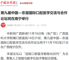 第九届中国—东盟国际口腔医学交流与合作论坛将于11月19—21日在广西南宁召开。中国新闻网、广西云-广西日报等央地媒体聚焦论坛动态,先后发文报导。 中国新闻网:https://m.chinanews.com/wap/detail/chs/zw/3495922hewxrzkdf.shtml 广西云-广西日报报道链接:https://apph5.cloudgx.